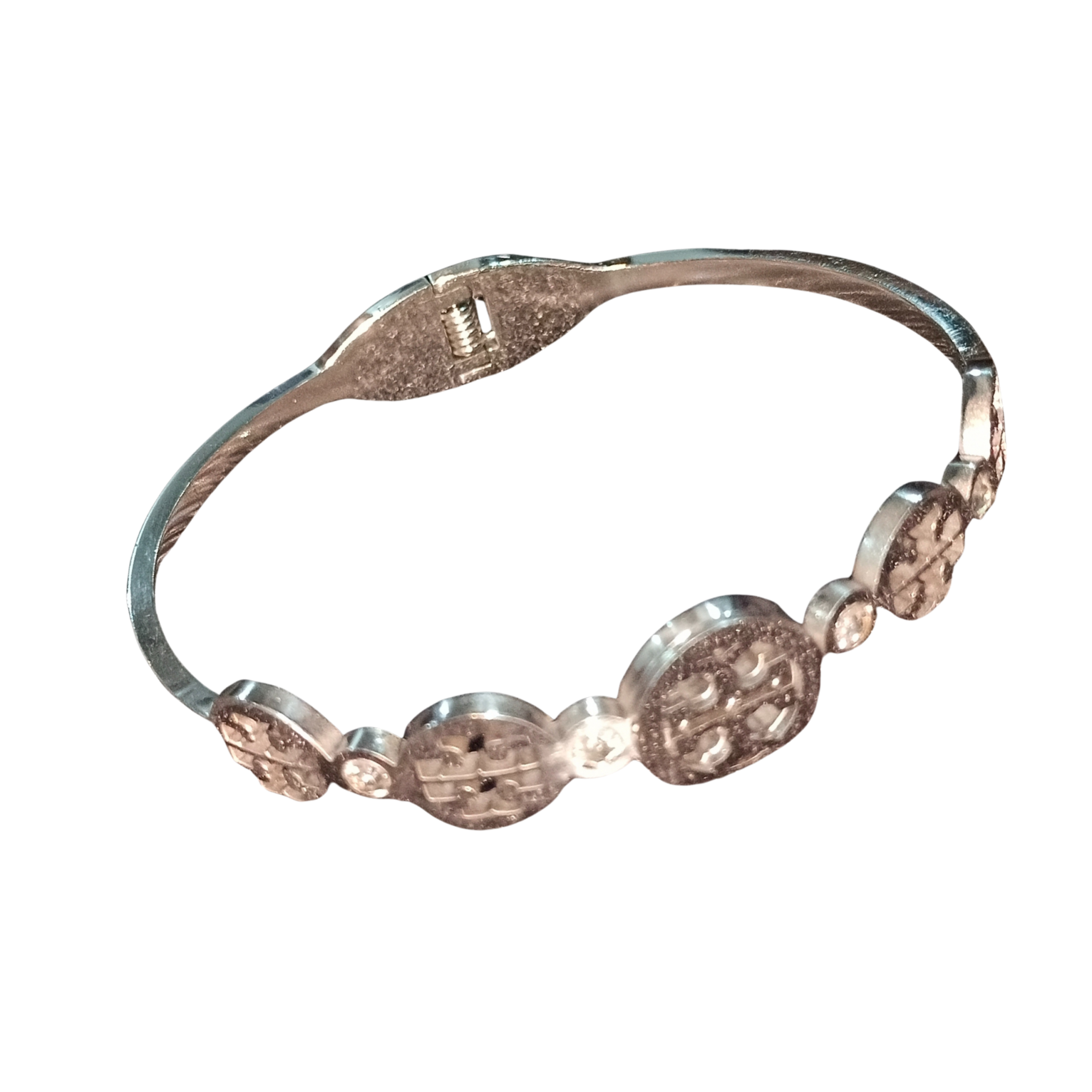 This beautifully crafted silver-tone bracelet combines traditional design elements with a modern finish. The front features engraved circular motifs accented with delicate stone embellishments, creating a refined and graceful look. Its slim and lightweight structure ensures comfortable wear throughout the day. The adjustable screw-lock mechanism provides a secure fit while maintaining a clean, seamless appearance.
