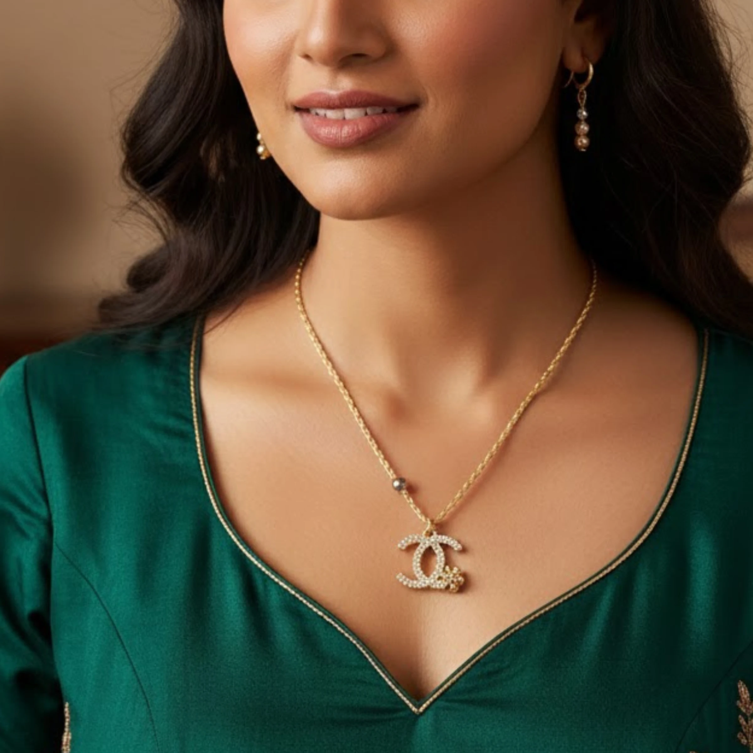 Elevate your traditional look with this elegant dual-tone chain featuring a delicate pendant. Designed to blend modern charm with classic elegance, this piece showcases golden and silver bead accents, a fine chain, and a sparkling heart charm adorned with crystal detailing. A perfect choice for weddings, festive occasions, and special celebrations.