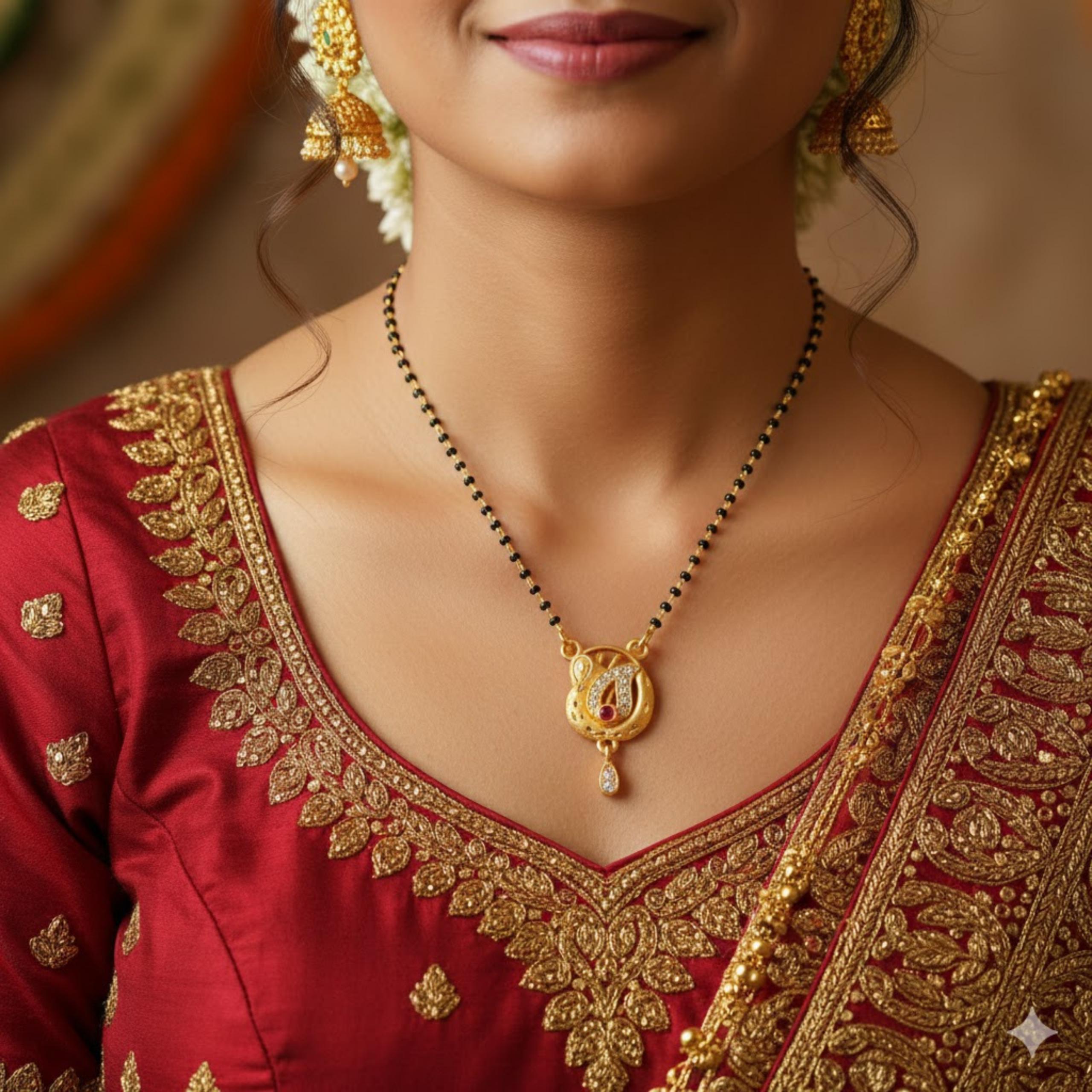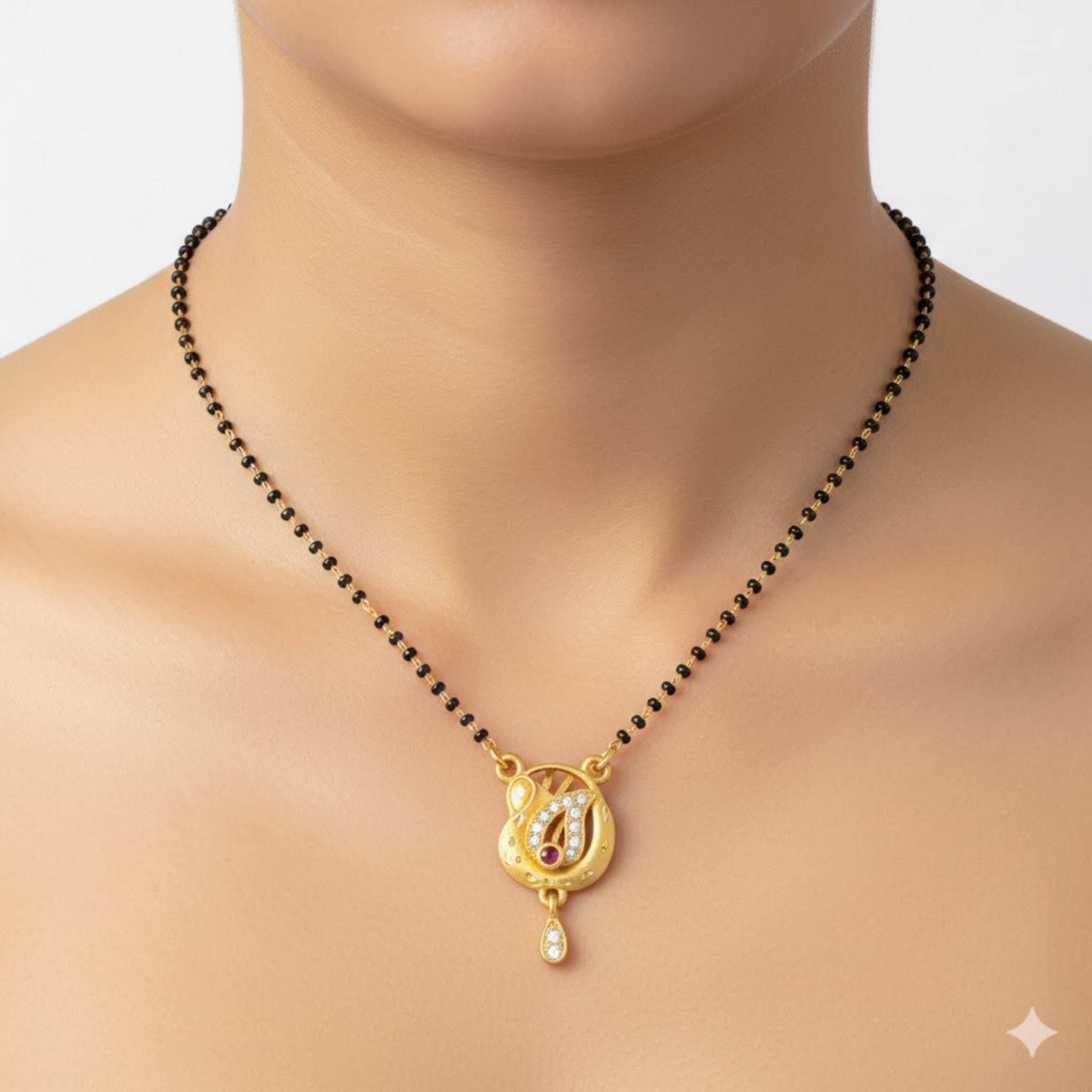 This stunning mangalsutra features a traditional black-and-gold beaded chain paired with an intricately designed gold-toned pendant. The pendant showcases sparkling cubic zirconia stones arranged in a graceful pattern, complemented by a striking ruby-colored central stone. A teardrop-shaped CZ drop adds extra charm, making it perfect for both daily wear and special occasions.