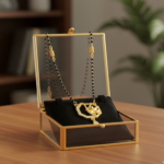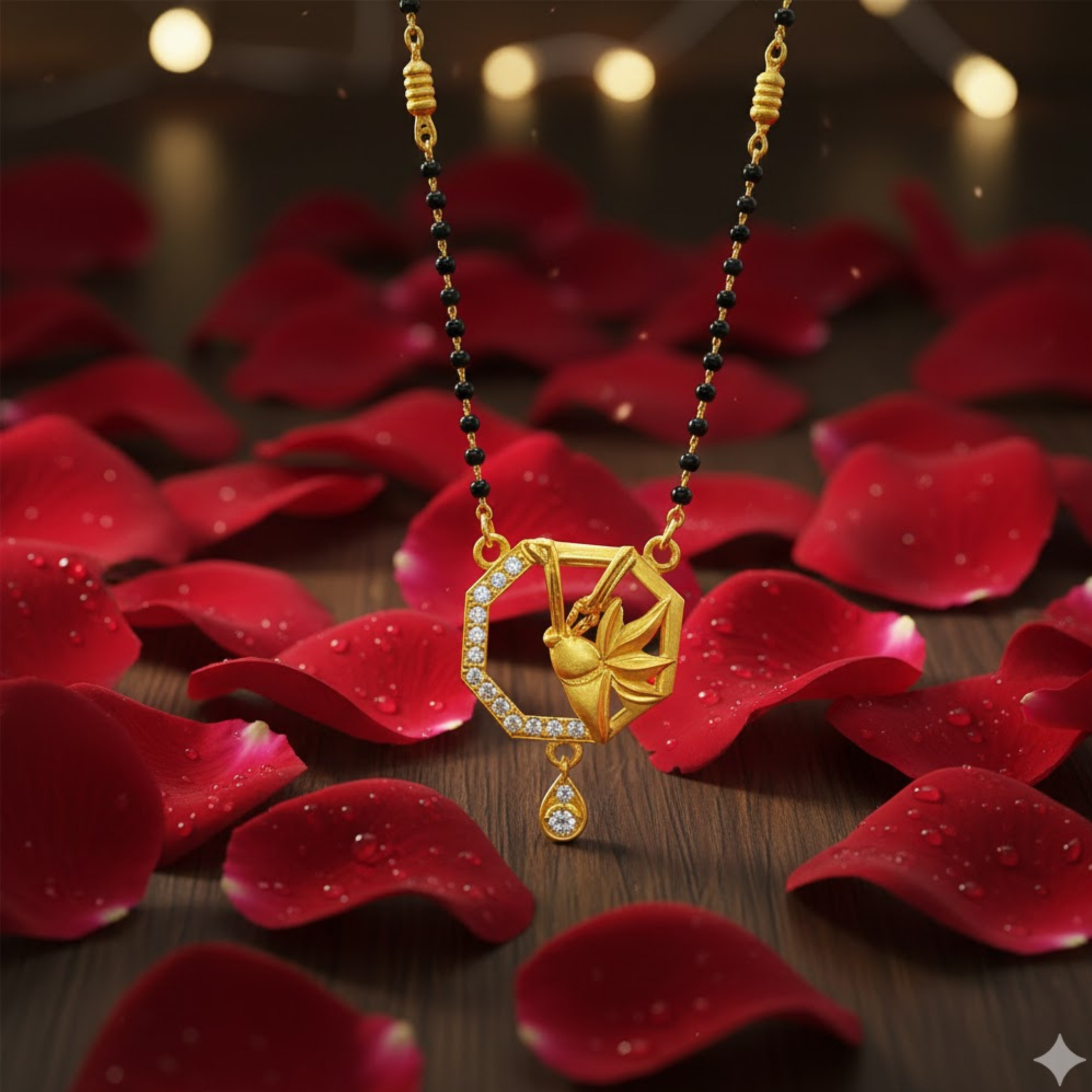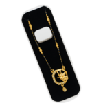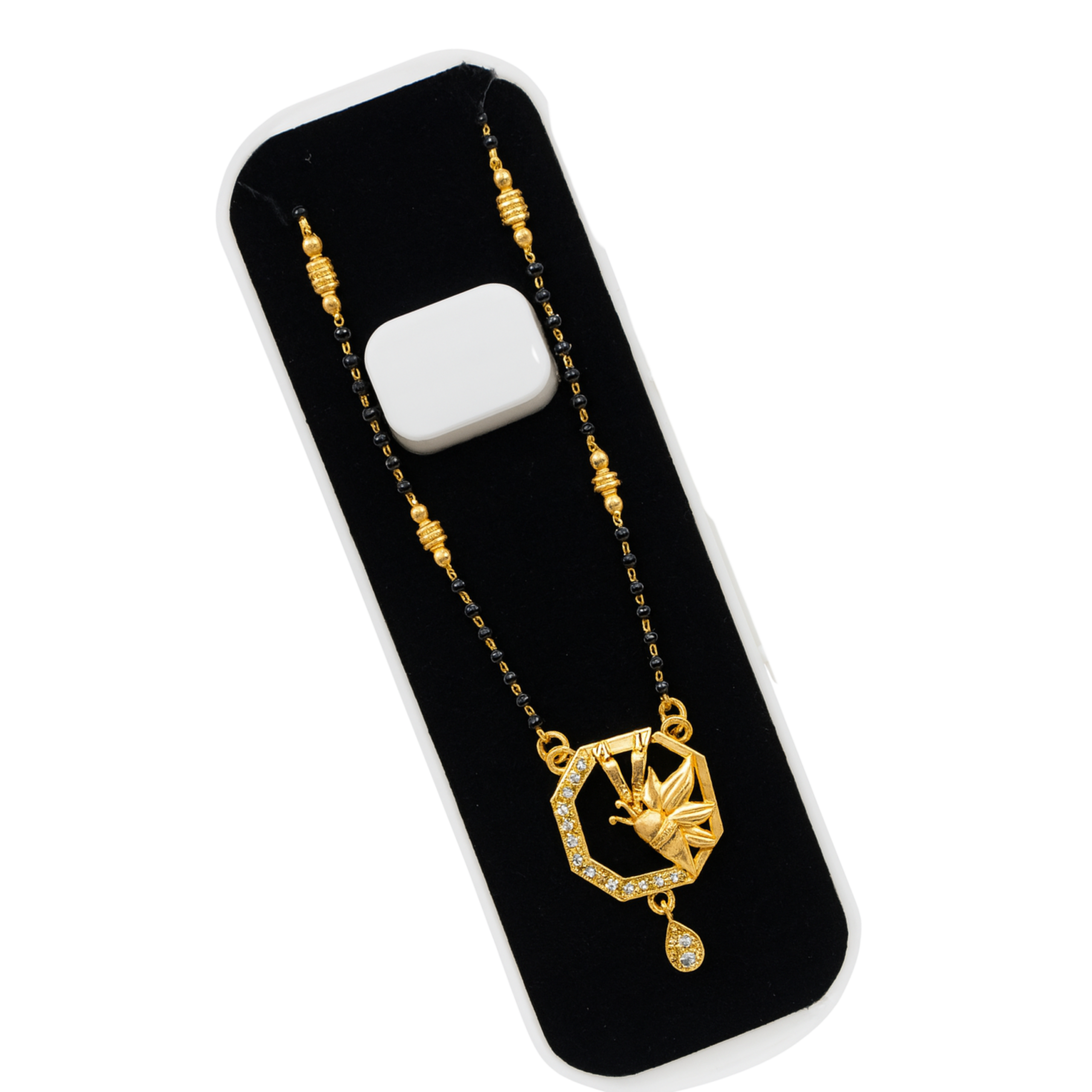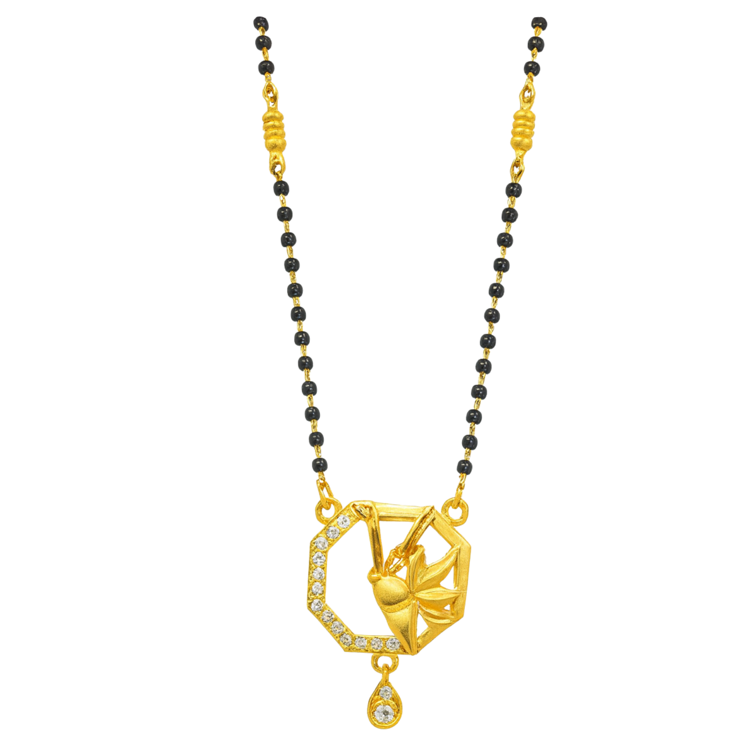 This graceful mangalsutra features a classic black bead chain paired with a uniquely designed geometric gold-finish pendant. The pendant highlights a modern octagonal frame adorned with shimmering white stones and a delicately sculpted gold motif at the center, finished with a small dangling charm. The design represents strength, balance, and elegance?perfect for women who appreciate tradition with a contemporary twist.