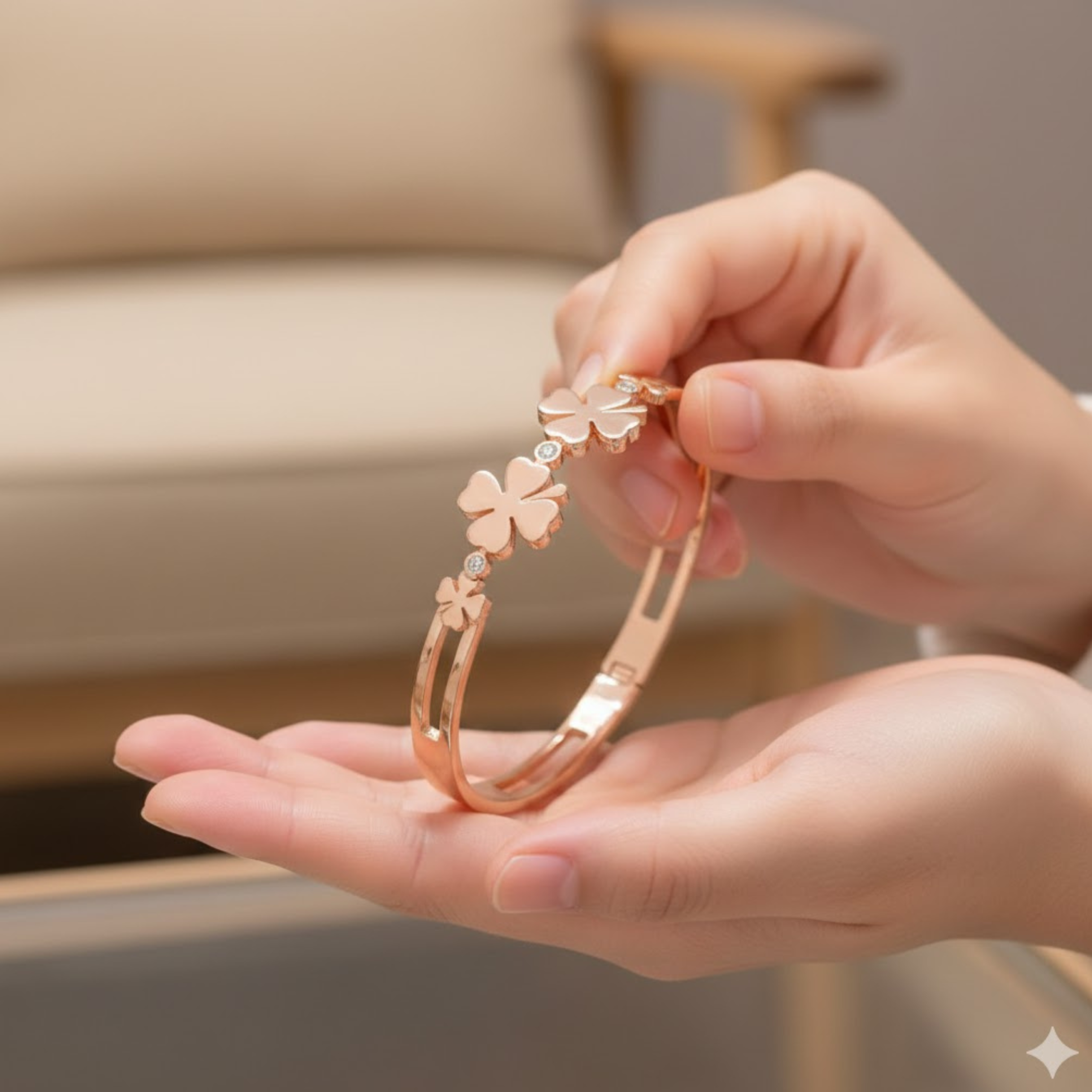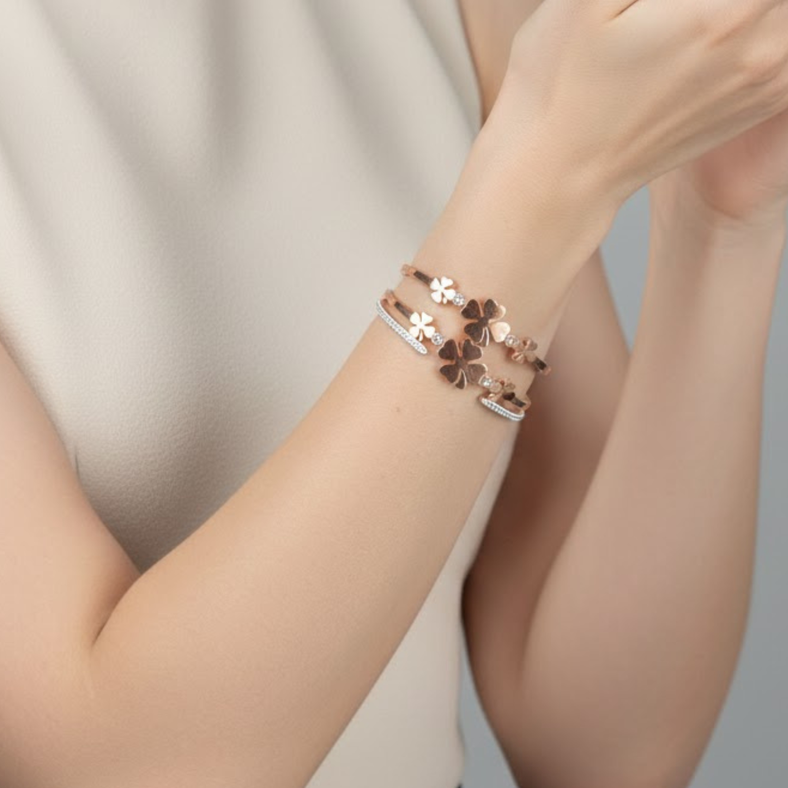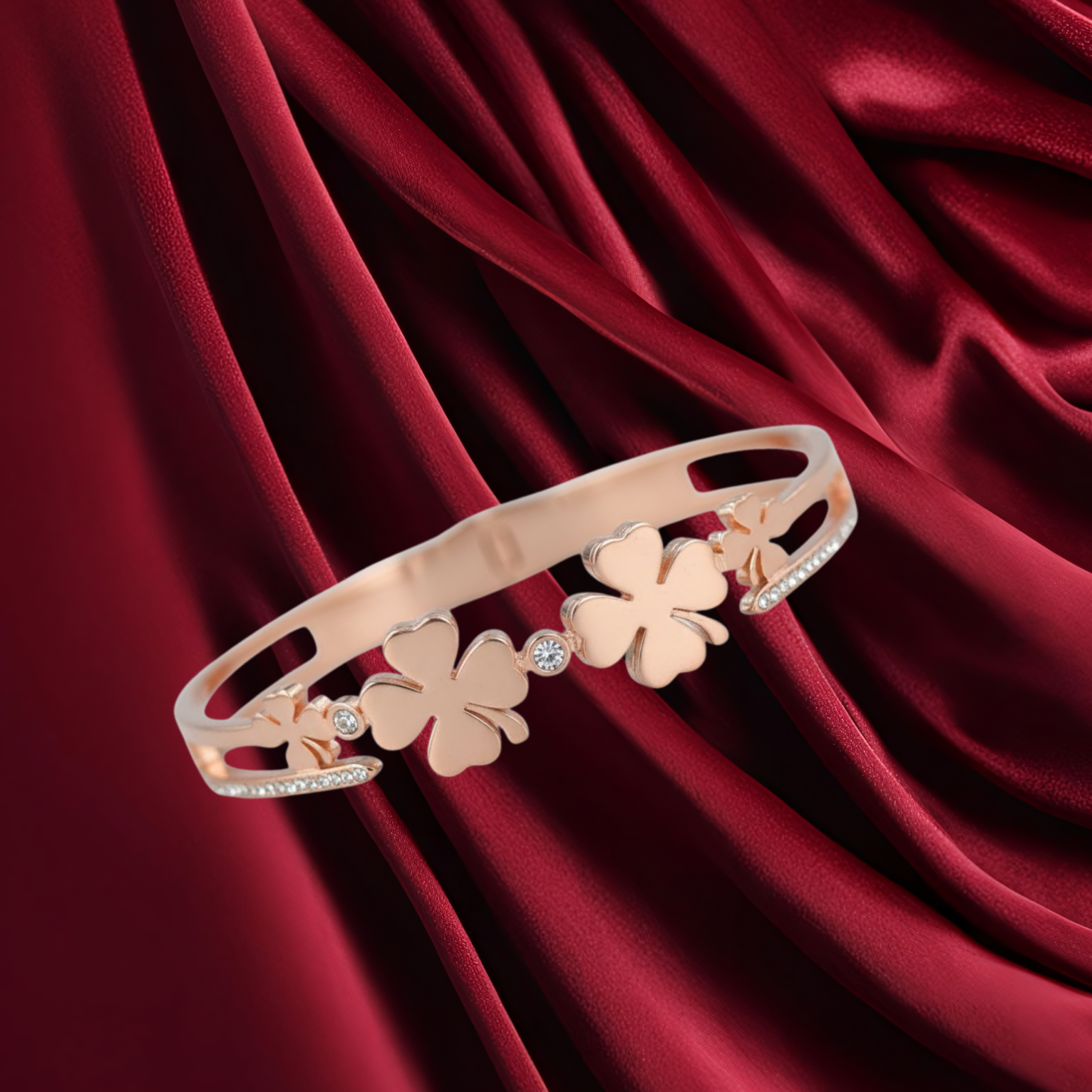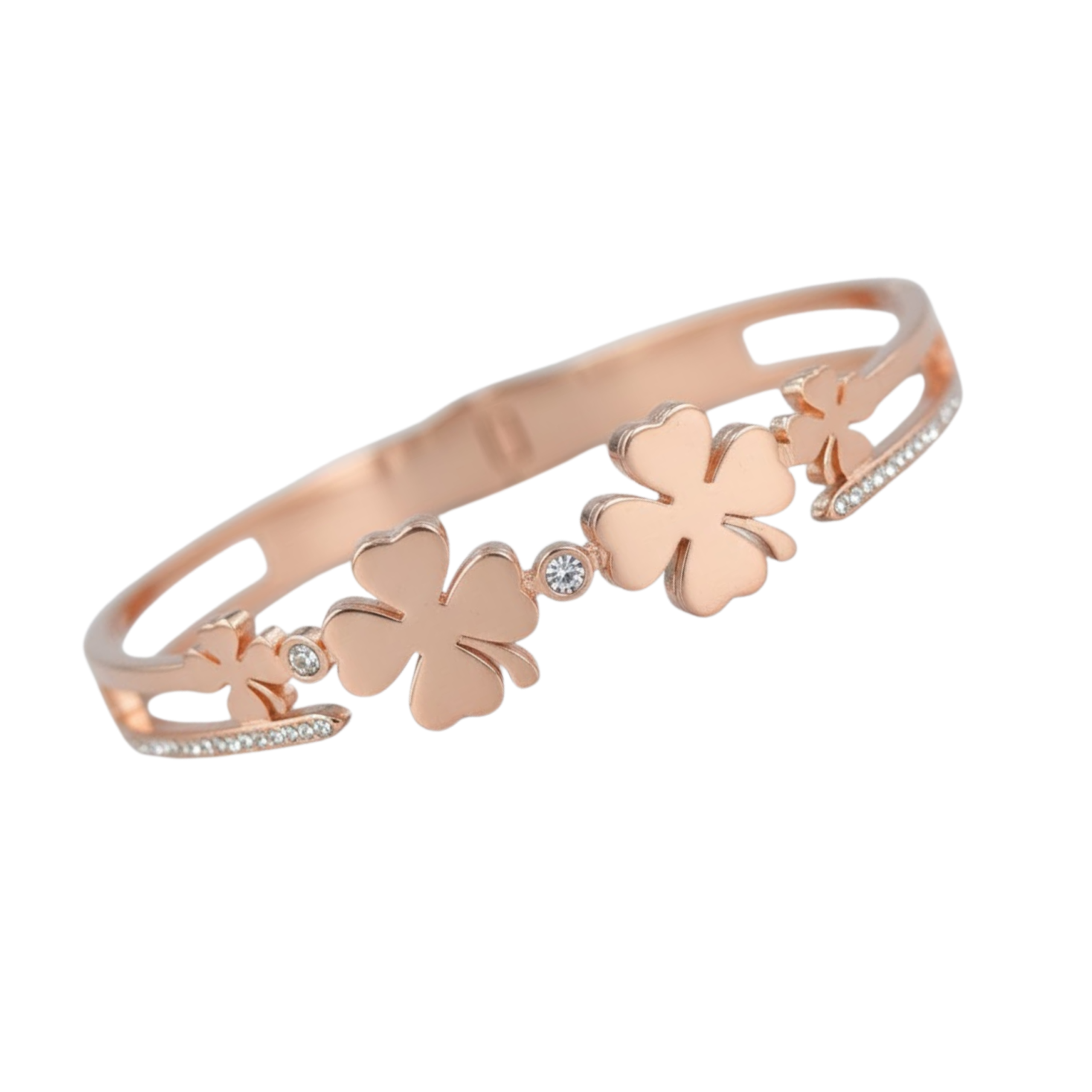 This elegant bracelet features a sleek rose gold?finish band adorned with graceful clover-shaped motifs crafted from heart-like petals. The central design symbolizes luck, love, and positivity, while delicate stone detailing on the sides adds a subtle sparkle. With its refined silhouette and modern charm, this bracelet is perfect for everyday elegance as well as special occasions.