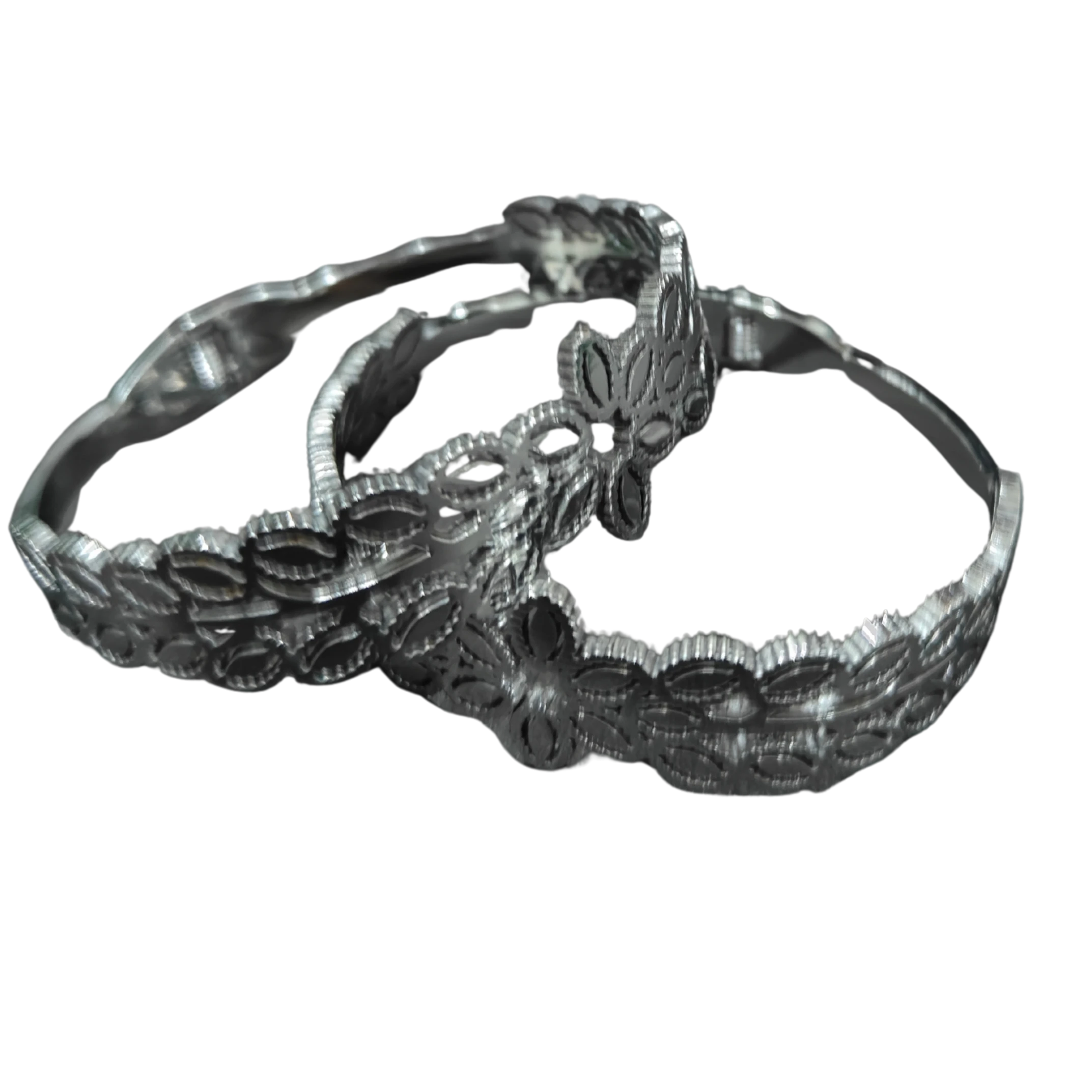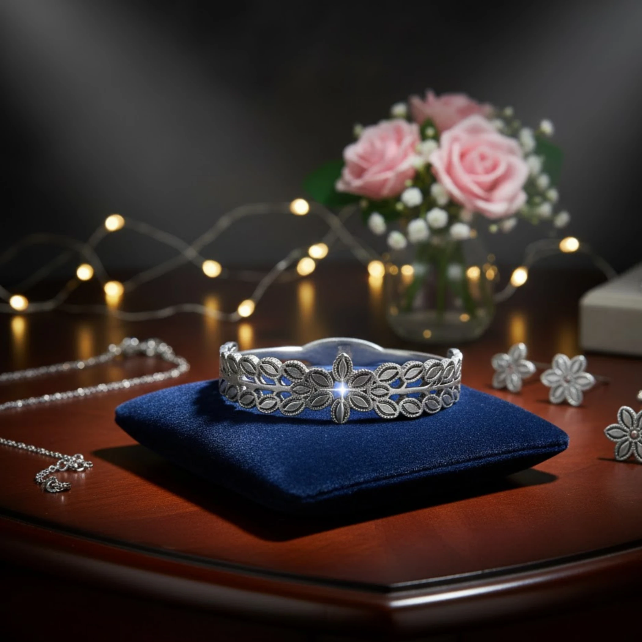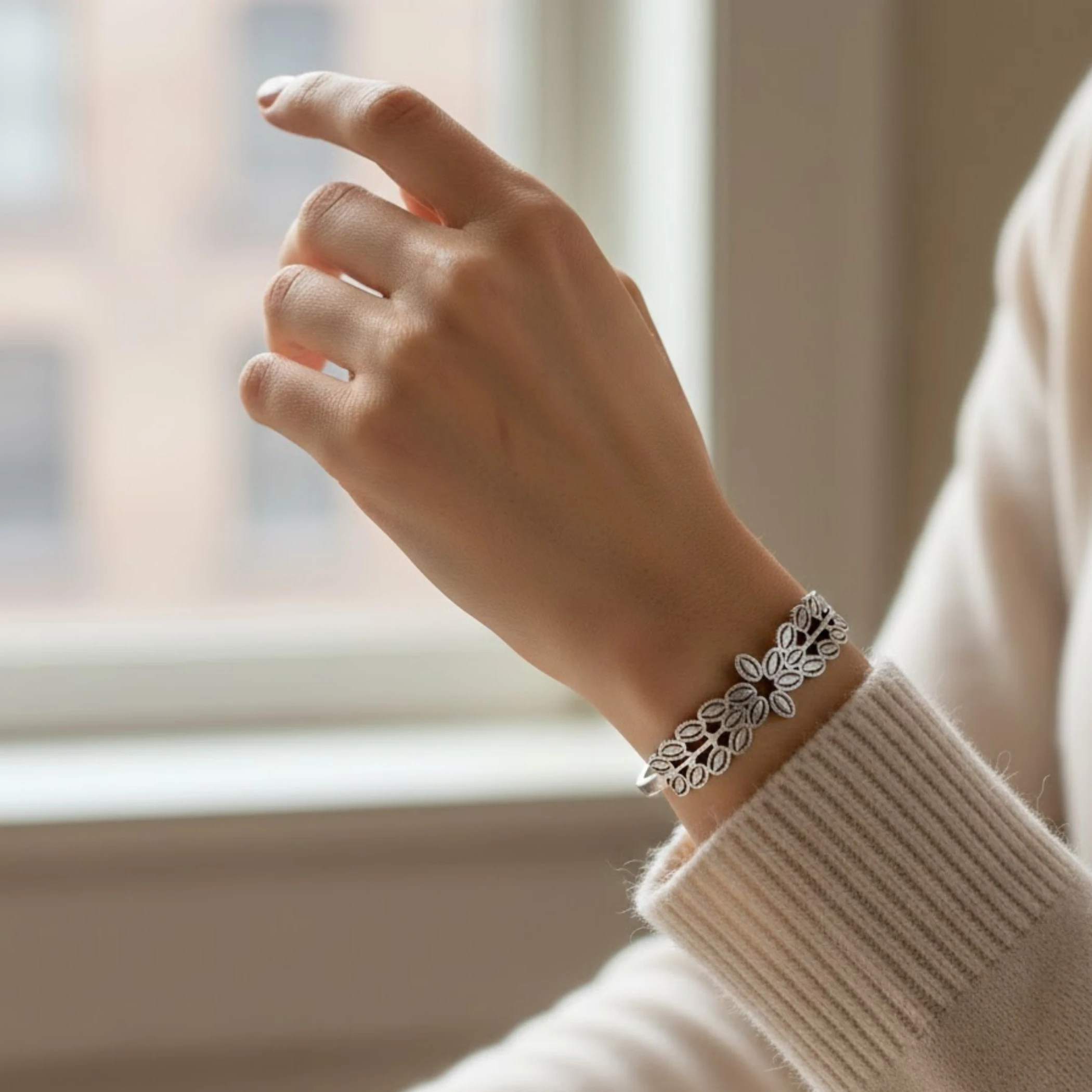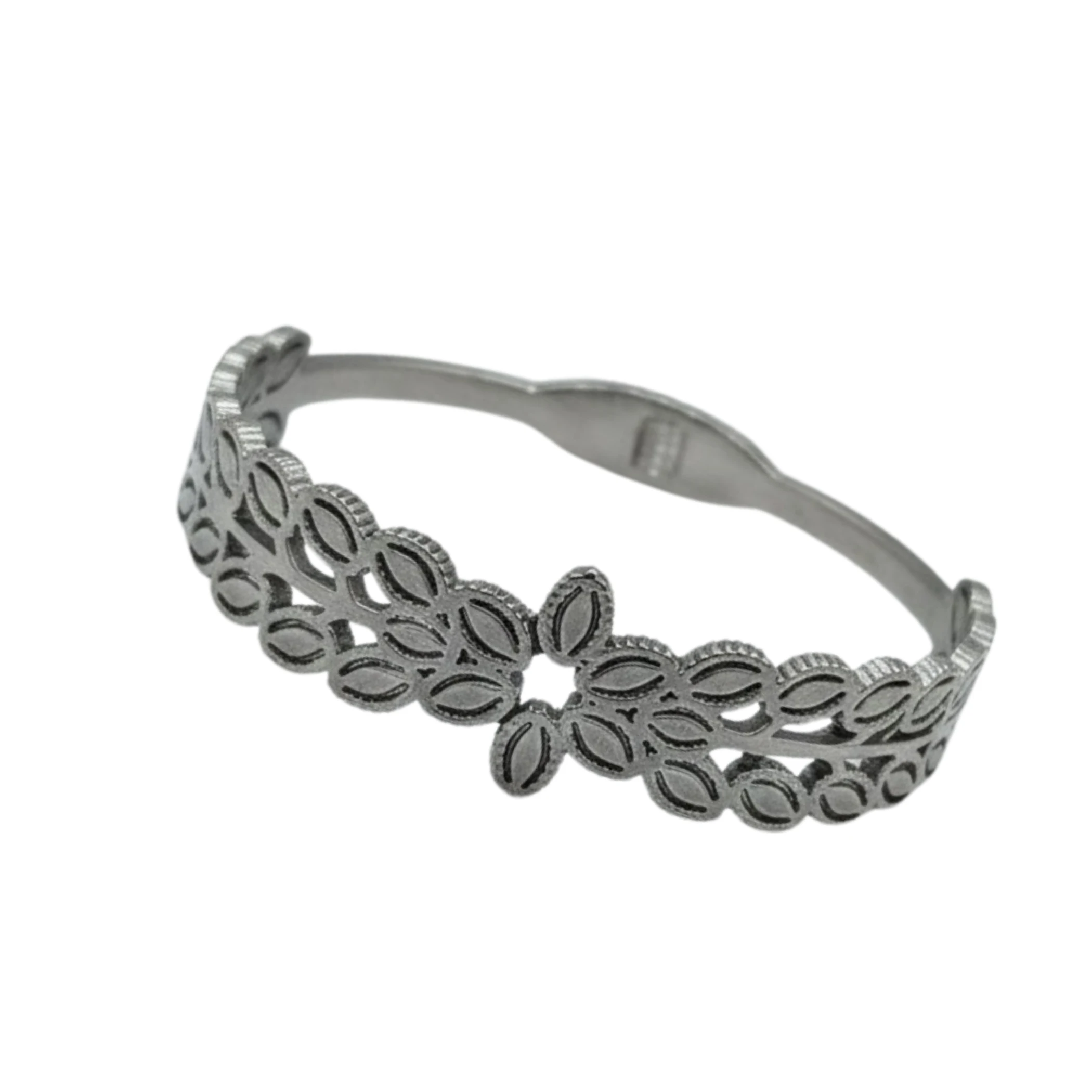 Rose Silver-Finish Leaf Design Open Cuff Bracelet